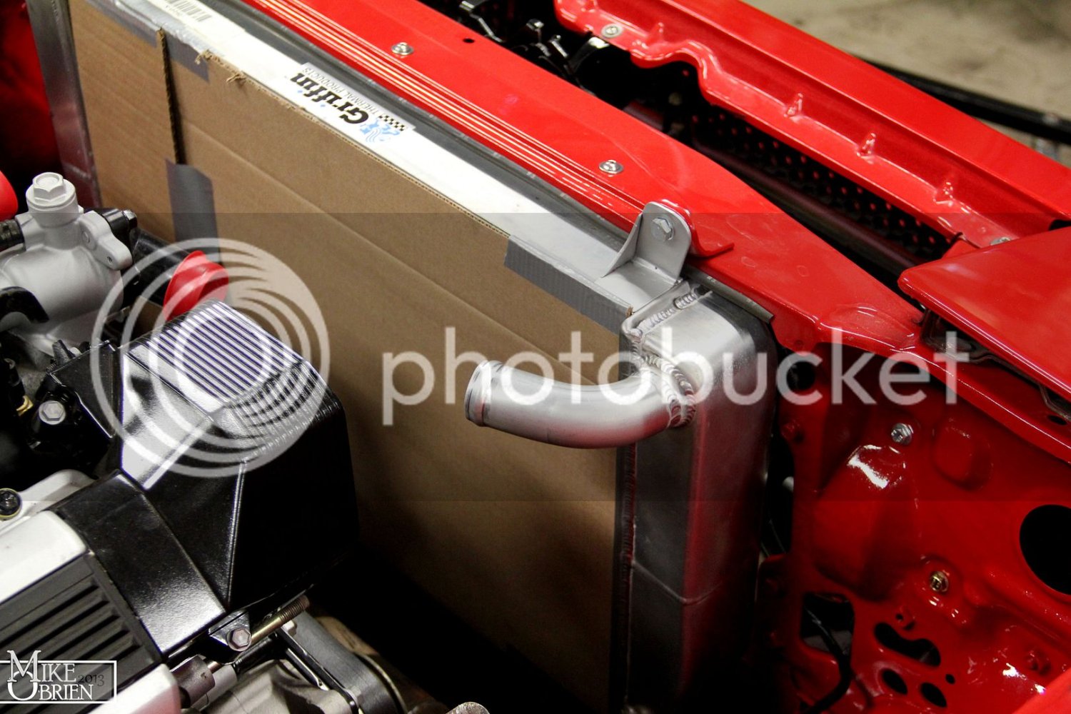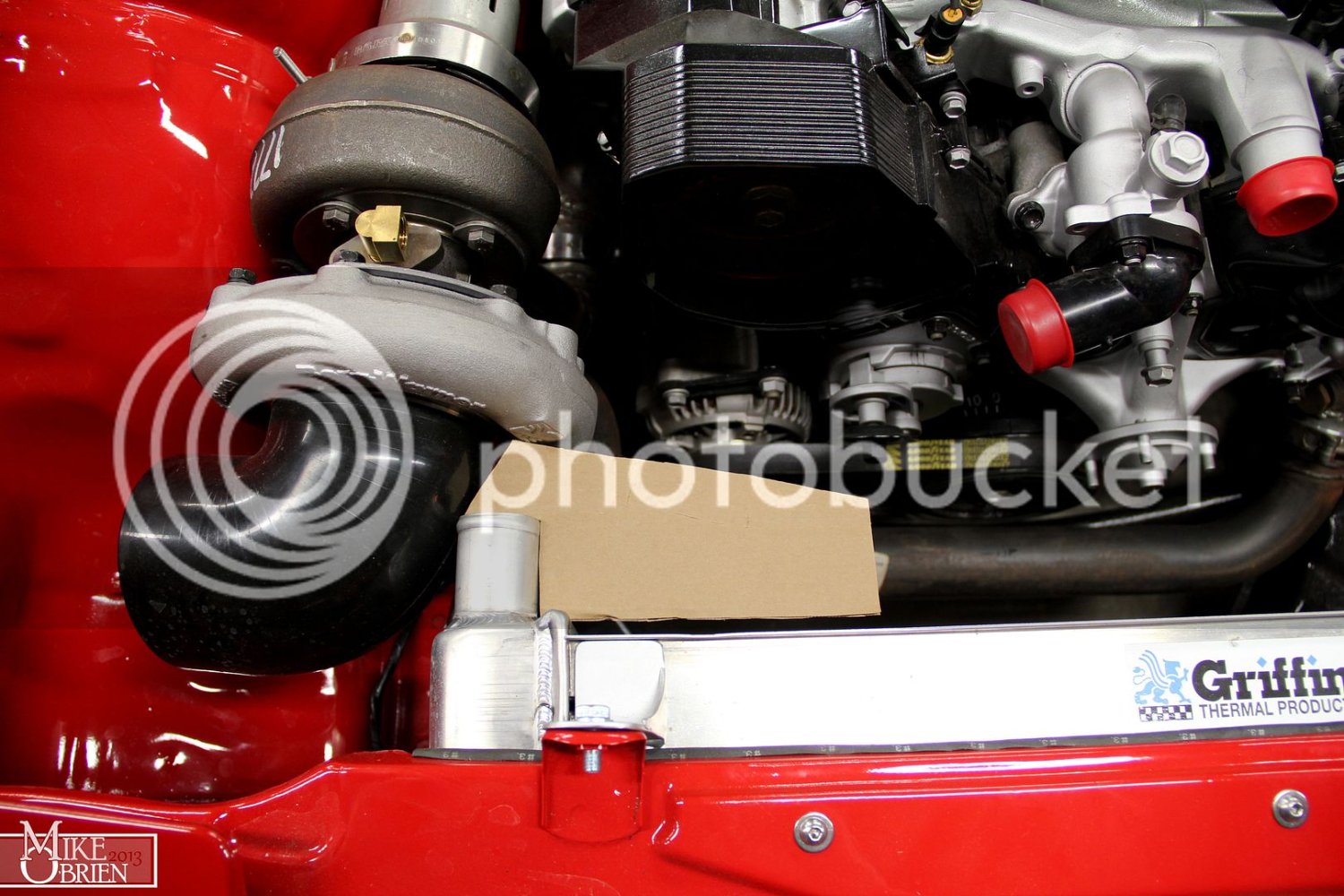 With the radiator tucked partially under the core support, and the fans being mounted pusher style, the best place for the wastegate was out in front.