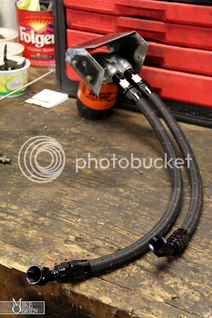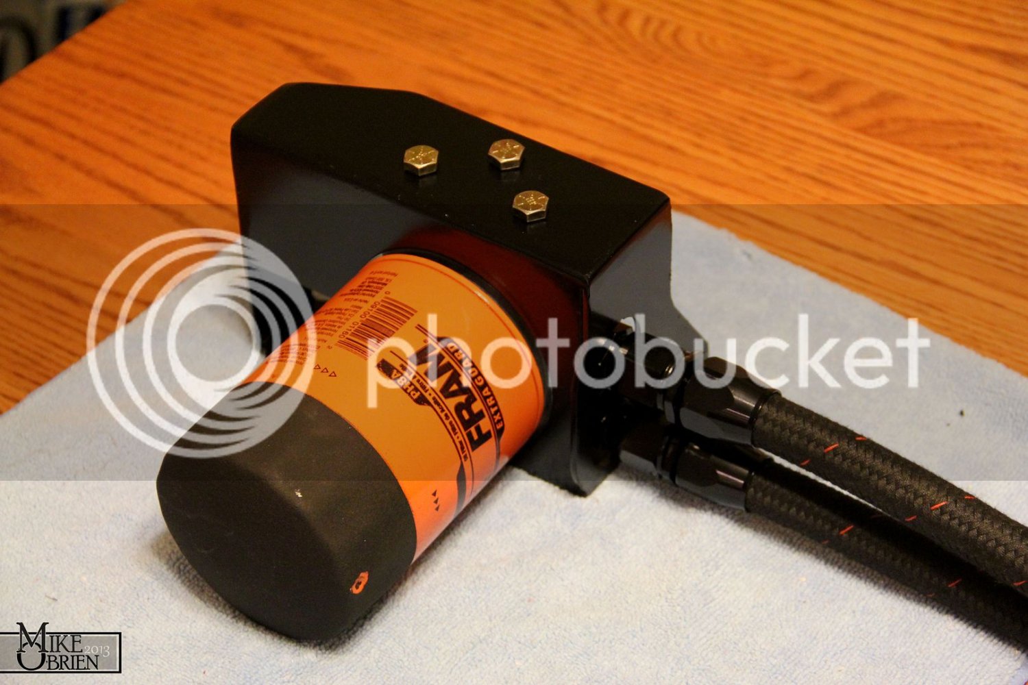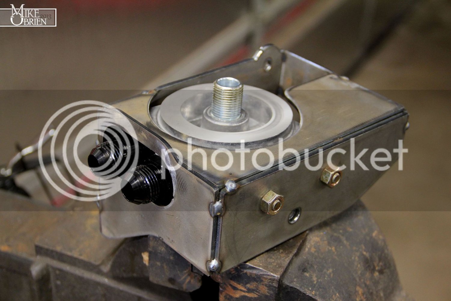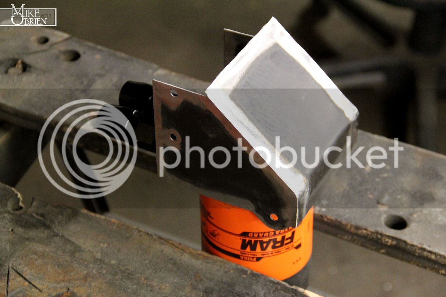 Using my previous template for the oil filter mount, I designed a much nicer and more secure version from 10 gauge steel. Notice the nice weld edges left to fill with weld. This will leave a nice finish after grinding the edges smooth. The rear of the mount is left open, as the fuel hard line needs to pass through it to mount to one of the holes that they will both share.