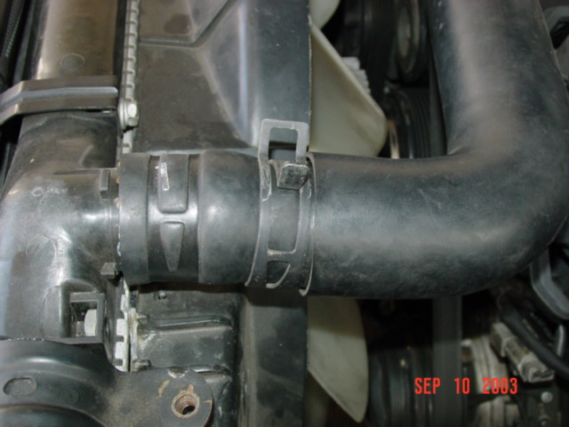 This picture shows loosen radiator hose clip/clamp. Move it away from the radiator outlet.