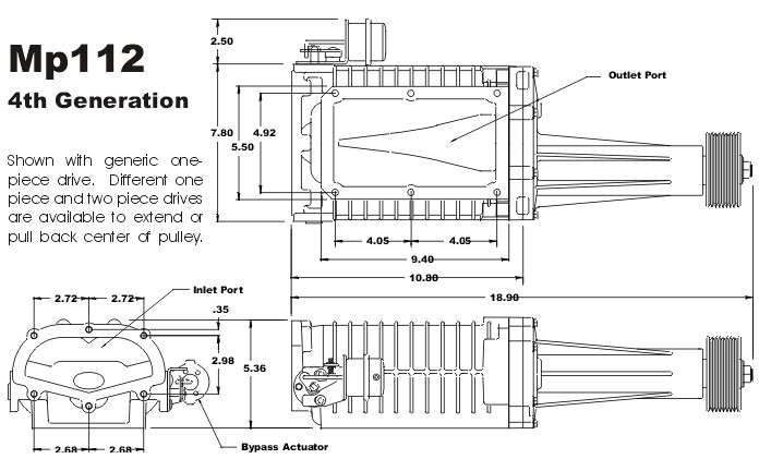The Magnuson/Eaton Model MP112, 4th Generation is a “State of the Art” supercharger, engineered for 4.6 to 6.0 litre passenger cars and light truck engines. It was designed as a compact, flexible supercharger for increased power with original equipment quietness and reliability without adversely affecting fuel economy. The M112 has proven itself in a  number of original equipment and aftermarket applications on a variety of engine sizes.